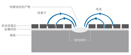 ● 損傷的自愈作用 噴鋅層的一個(gè)主要特點(diǎn)是能夠在損傷處自動修補(bǔ)保護(hù)層,以保護(hù)保護(hù)層的完整。鋅離子通過密封毛孔(即瀝青漆涂料)遷移到損傷處填補(bǔ)傷口并轉(zhuǎn)變成穩(wěn)定的不可溶解的鋅化物。