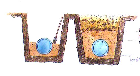在多是石塊的土層情況下,為保護(hù)管子有條理地連續(xù)置放,應(yīng)考慮安裝層的問題(松軟土質(zhì)不必考慮)。安裝層由松軟的顆粒狀物質(zhì)組成(沙土、小碎細(xì)石粒、過篩土),其厚度應(yīng)保證底部距石塊層最小距離≮100㎜。見圖1