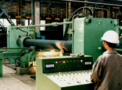 ●工藝簡要:將承口芯安裝到離心機(jī)上,球化合格的鐵水倒入定量包內(nèi),按照工藝規(guī)定要求,設(shè)定孕育劑加入量、管模粉加入量,計(jì)算機(jī)控制離心機(jī)的旋轉(zhuǎn)速度、行走速度及定量包的翻轉(zhuǎn)速度,鐵水隨著定量包的翻轉(zhuǎn)及離心機(jī)的行走澆注在旋轉(zhuǎn)的管模內(nèi),并凝固成管子,拔管鉗將管子從模內(nèi)拔出。
