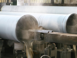 ●工藝簡要:攪拌系統(tǒng)將一定比例的水泥、沙子和水進(jìn)行充分均勻的混合,再采用離心噴涂工藝將混合后的水泥涂覆到管道內(nèi)表面,可以得到壓實(shí)致密的、表面平整的水泥內(nèi)襯。水泥內(nèi)襯是球墨鑄鐵管常規(guī)的、典型的內(nèi)防腐形式。